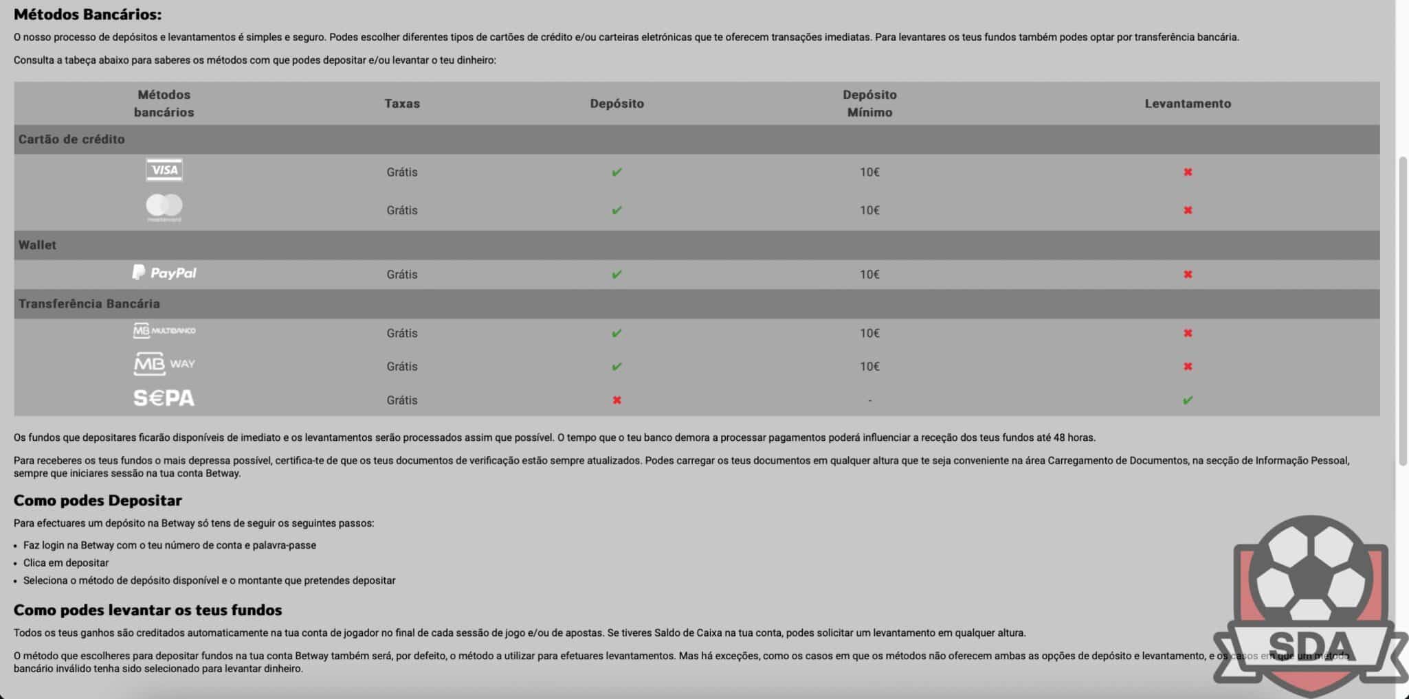Segundo a Betway, não existem quaisquer taxas para depósitos e levantamentos.