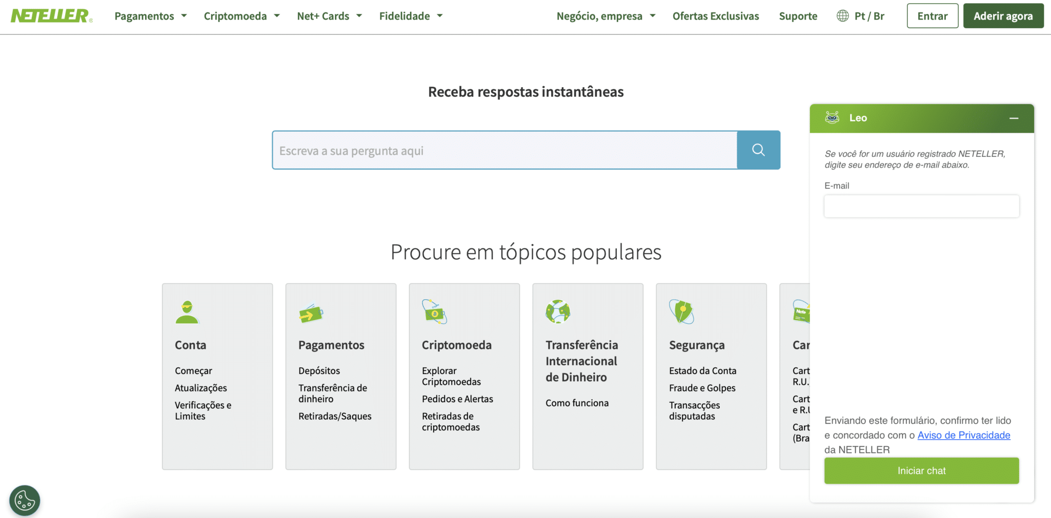 A Neteller oferece uma série de opções de suporte ao cliente para ajudar os utilizadores com suas dúvidas e problemas. Sua infraestrutura de suporte inclui uma seção abrangente de perguntas frequentes em seu site, que aborda questões e problemas comuns. Além disso, eles fornecem um chatbot para respostas rápidas e automatizadas e oferecem a possibilidade de entrar em contato com o atendimento ao cliente por e-mail e telefone.